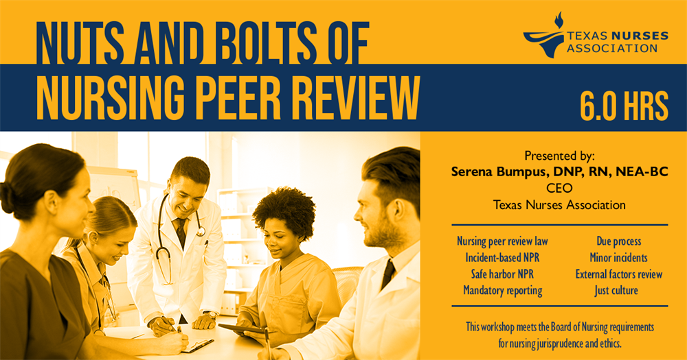 This workshop covers the nursing peer review law and BON rules on incident-based and safe harbor nursing peer review. Topics include mandatory reporting requirements, due process protections, minor incidents, external factors review, and a just culture approach. This workshop meets the BON requirements for nursing jurisprudence and ethics CNE.