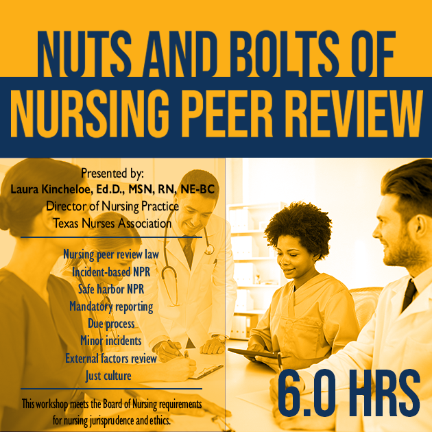 The Nuts and Bolts of Nursing Peer Review facilitates a discussion around nursing peer review requirements in Texas necessary to effectively guide the evaluation of a nurse's practice. This workshop allows for a candid, but confidential, conversation with the Texas Nurses Association's Director of Nursing Practice around nursing peer review.